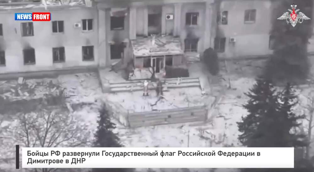 Минобороны России опубликовало видео, на котором запечатлено, как российские военнослужащие разворачивают флаг страны в городе Димитров в ДНР. Флаг развернули бойцы 5‑й отдельной гвардейской мотострелковой бригады имени А.В. Захарченко после зачистки города от окруженных в нем военных ВСУ.