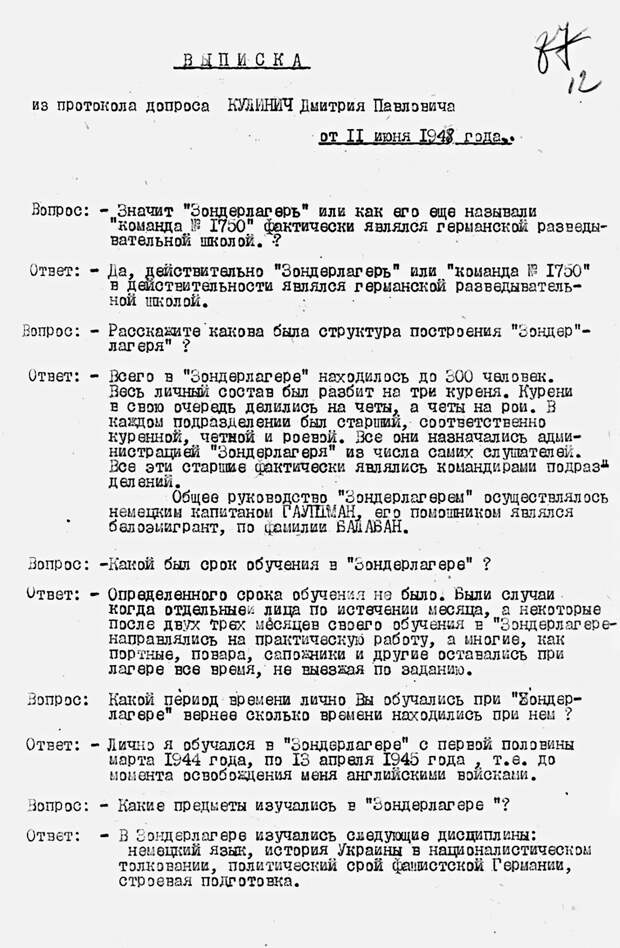 Выписка из протокола допроса Д.Кулинича а его пребывании в зондерлагере №1750, где готовились агенты-диверсанты